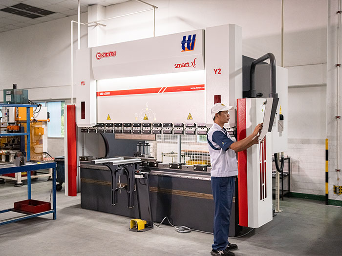曲げ加工は、金属の板材を曲げてさまざまな形状に加工する技術で、精密板金加工の工程の中でも最も難しい技術です。プレスブレーキやベンダーと呼ばれる工作機械を使って加工しています。